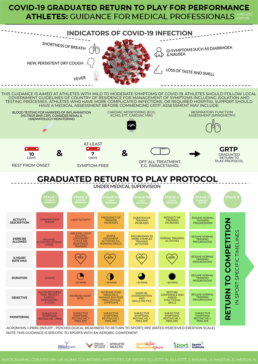 Gli stessi campionati sportivi professionistici sopra menzionati hanno eseguito un modello efficace di ritorno al gioco/allenamento (RTP) che includeva un protocollo di test cardiaco avanzato ed esteso.