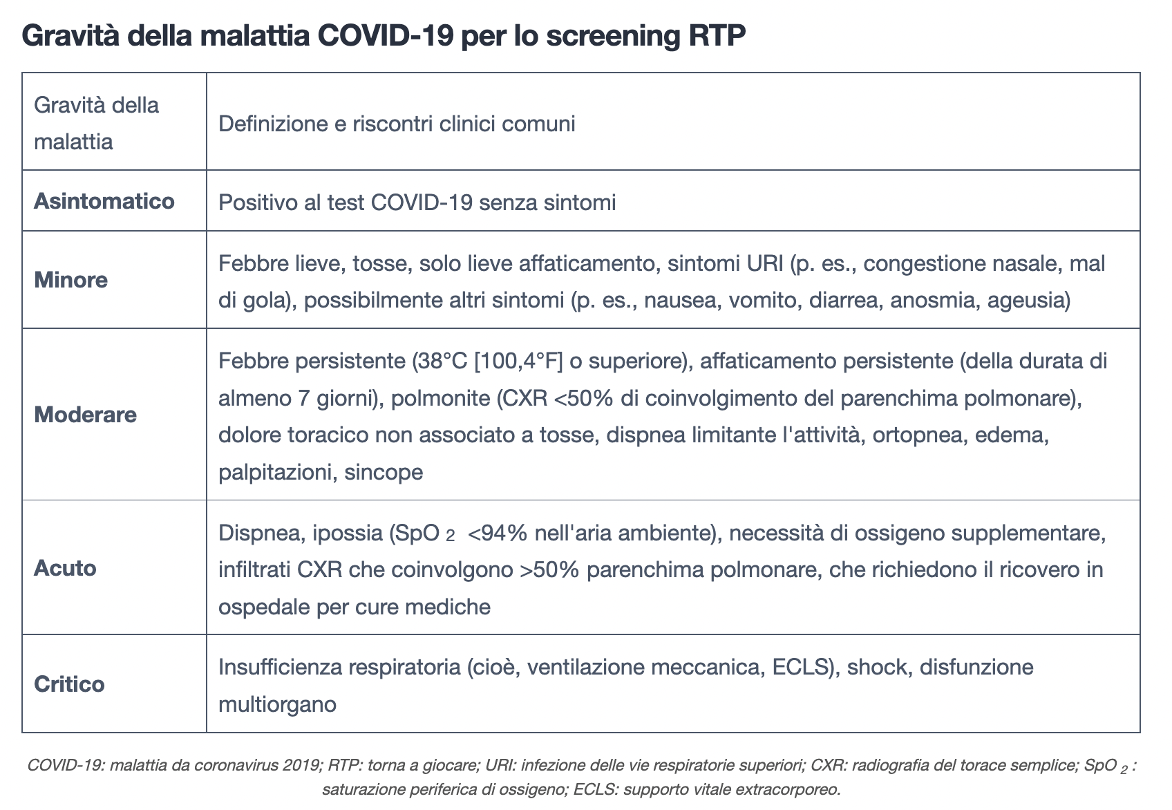 Gravità della malattia COVID-19 per lo screening RTP